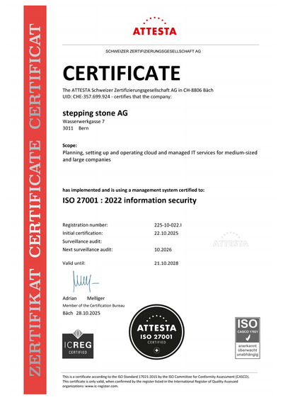stepping stone AG has been certified according to ISO/IEC 27001:2013 since October 2019.In fall 2024, the transition audit to ISO/IEC 27001:2022 has been successfully completed. In October 2025, stepping stone AG was successfully recertified by ATTESTA Swiss Certification Company AG.